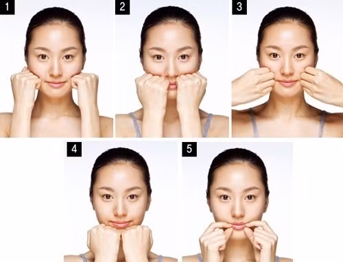 Bạn dùng những đầu bàn tay đặt dưới cằm và dịch rời theo như hình xoắn ốc từ dưới lên trên cho đến phía xương hàm tiếp tục với tai và lặp lại động tác này 15 lần.