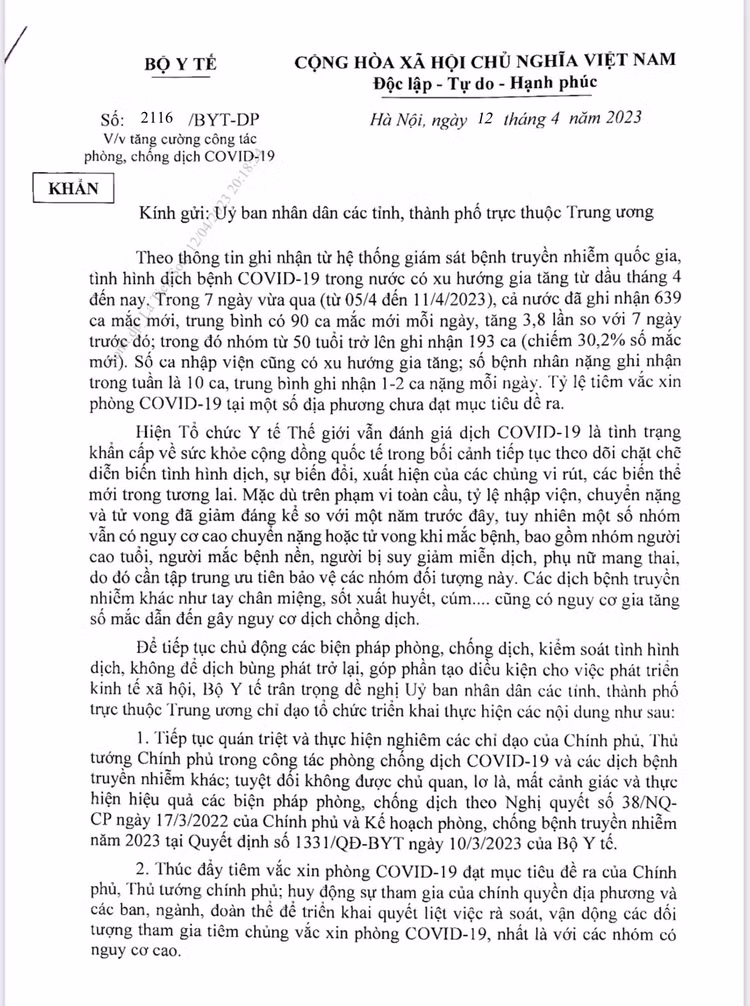 Ngày 12/4, Bộ Y tế đã có công văn khẩn gửi UBND các tỉnh, thành phố trực thuộc Trung ương về tăng cường các biện pháp phòng chống dịch COVID-19.