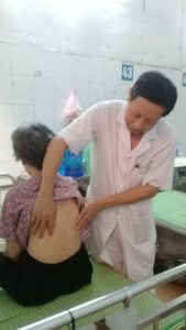 Sau khi được các bác sĩ thăm khám, chụp X-quang, cắt lớp vi tính cột sống thắt lưng. Kết quả chụp cho thấy, bệnh nhân bị xẹp đốt sống thắt lưng L1. Các bác sĩ tiến hành hội chẩn và đưa ra phương pháp bơm xi măng sinh học vào thân đốt sống cho bệnh nhân.