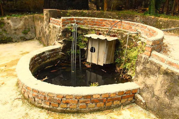 Cách xây miệng giếng xem qua thì lạ. Nhưng thực ra, nó là kiểu thiết kế ứng dụng được ở vùng đồi núi. Phần đất cao thì miệng giếng phải cao hơn hẳn để tránh nước bẩn và đất xung quanh tràn vào. Phần thấp hơn, thường là ở phía để đứng lấy nước.