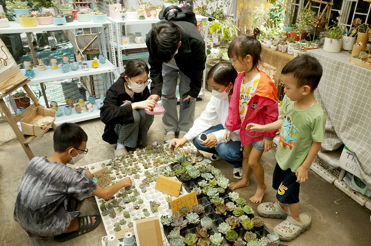 | Việc đổi chai nhựa cũ lấy sen đá đã thu hút rất nhiều bạn trẻ đến đây. |
