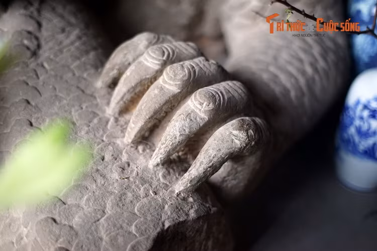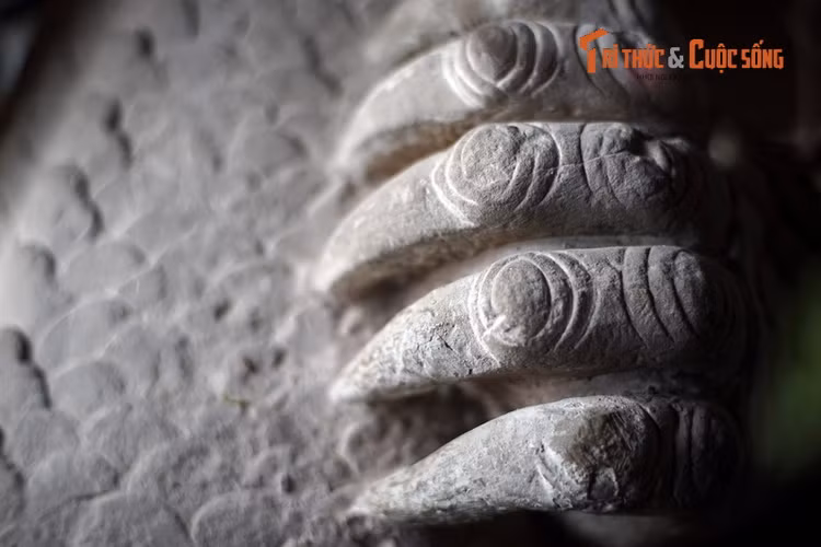 Chân rồng khuỳnh rộng sang hai bên với những móng vuốt nhọn hoắt, gân guốc, mỗi chân xòe rộng năm ngón bấu chặt vào phần thân đuôi.