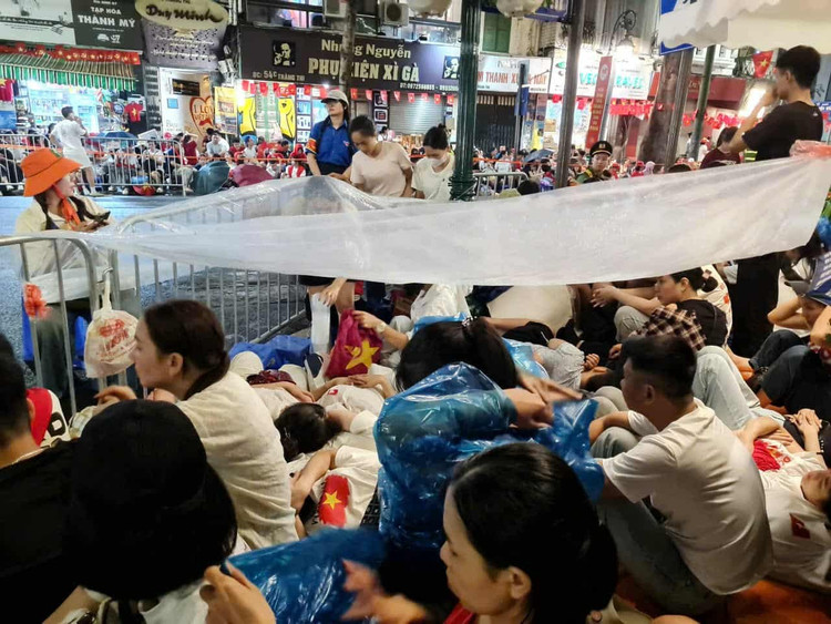 2h40: Sân vận động Mỹ Đình xuất hiện mưa nhỏ. Người dân đội mưa chờ đoàn xe xuất phát.