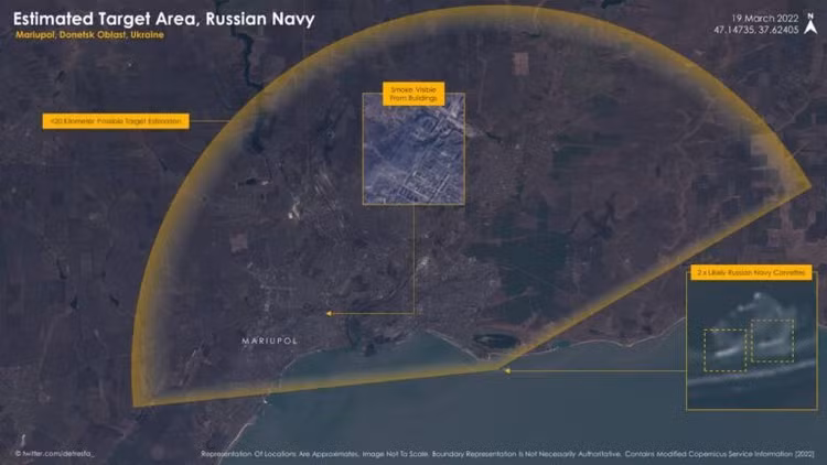 Một số bức ảnh vệ tinh xuất hiện trên mạng cho thấy, cuộc tiến công được các chiến hạm Nga yểm trợ hỏa lực.