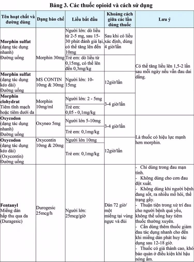 Với các cơn đau mức độ trung bình đến nặng, đặc biệt trên bệnh nhân ung thư giai đoạn cuối thì thuốc giảm đau nhóm Opioid là lựa chọn thích hợp, giúp cải thiện được chất lượng cuộc sống của người bệnh. Các loại thuốc và cách sử dụng các thuốc thuộc nhóm này được trình bày trong Bảng 3.
