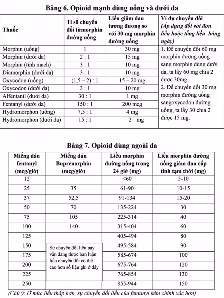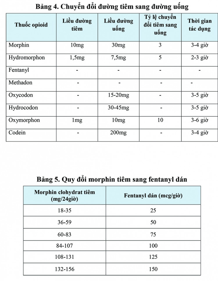 Do vậy, trên lâm sàng, bác sĩ điều trị thường phải cân nhắc lựa chọn loại opioid , liều dùng và cách dùng, cách chuyển đổi giữa các loại opioid phù hợp dựa trên một số yếu tố như: mức độ đau, đặc điểm dược động học và dược lực học của opioid (PK/PD), hiệu quả và an toàn của thuốc giảm đau trước đó, tính sẵn có của thuốc. Cách thức chuyển đổi của các thuốc opioid được mô tả như trong Bảng 4, Bảng 5, Bảng 6 và Bảng 7 dưới đây.