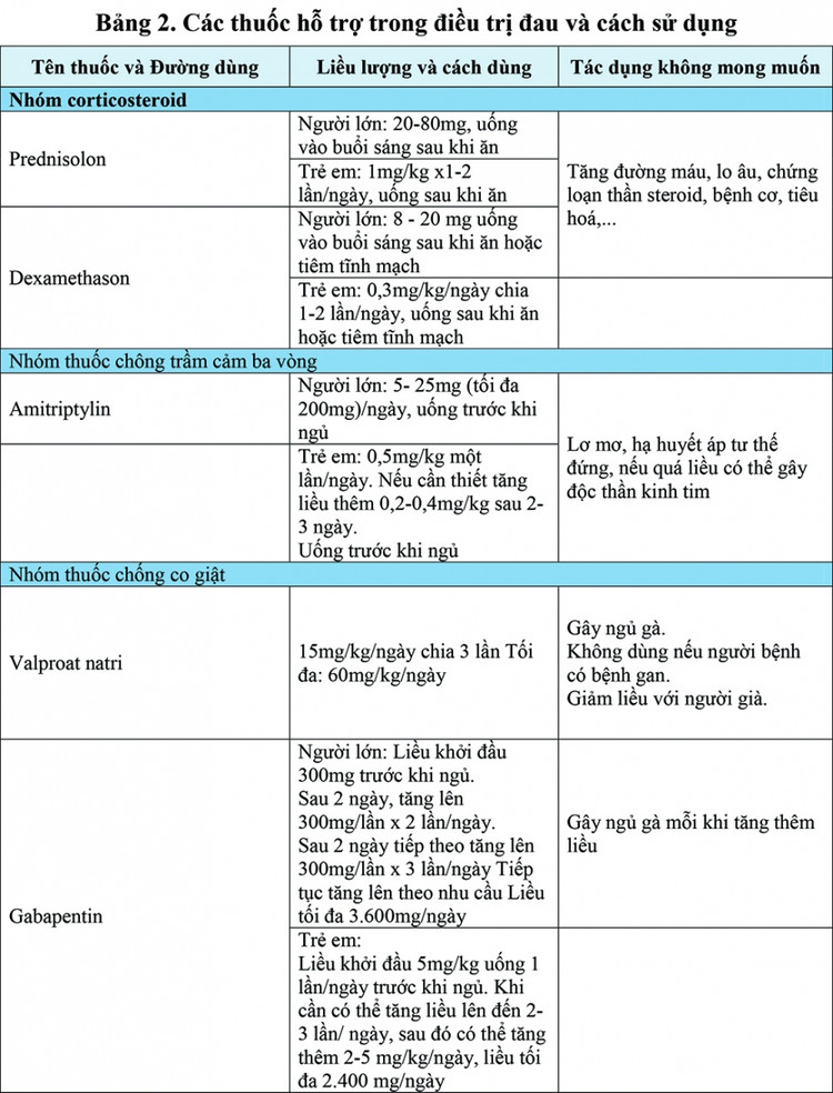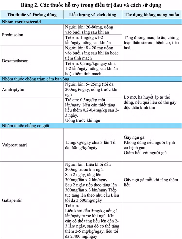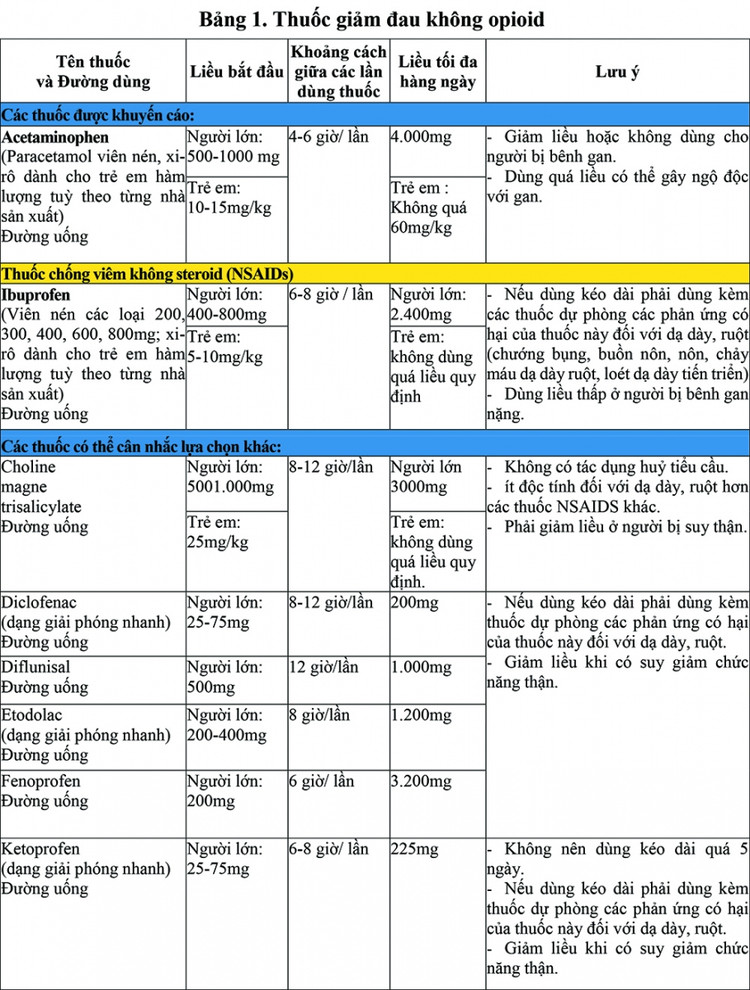 Với những cơn đau nhẹ, thuốc giảm đau không Opioid sẽ là lựa chọn phù hợp, ví dụ như thuốc chống viêm không Steroid (NSAIDS), bao gồm Ibuprofen, Acetaminophen..., được trình bày trong Bảng 1.