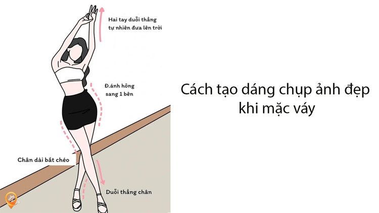 Chỉ đơn giản là đứng thẳng, 1 chân trụ, 1 chân hơi nhón và đưa ra xa nhưng với 2 tay đưa lên cao thì bạn sẽ trông cao hơn. Nếu bạn có một dáng người mảnh khảnh, bạn có thể chọn góc chụp thẳng này, nó giúp bạn khoe trọn bộ váy xinh mà bạn đã chọn cũng như dáng người của mình.