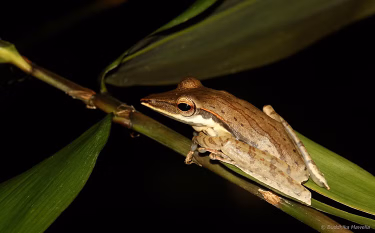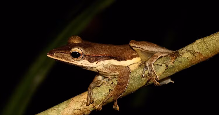 Điểm gây ấn tượng mạnh nhất ở Polypedates longinasus chính là phần đầu thuôn dài, khiến khuôn mặt của nó trông “nhọn” hơn hẳn so với các loài ếch khác. Cấu trúc này không chỉ mang tính thẩm mỹ kỳ lạ mà còn có thể đóng vai trò trong việc ngụy trang, giúp nó hòa lẫn với những chiếc lá nhọn hoặc cành cây mảnh. Khi đứng yên, cơ thể thon gọn cùng màu sắc xanh nâu khiến nó gần như biến mất trong môi trường xung quanh.