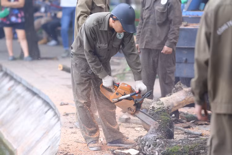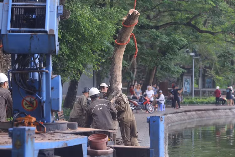 Sáng 24/5, Công ty TNHH MTV Công viên cây xanh Hà Nội thực hiện việc chặt hạ cây Sưa quý hiếm đã chết khô nằm sát bờ hồ Hoàn Kiếm (đối diện ngã 3 Lò Sũ - Đinh Tiên Hoàng, quận Hoàn Kiếm, Hà Nội).Ảnh: T.Huy