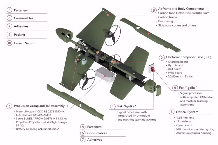 Các chi tiết kỹ thuật từ sơ đồ được công bố cung cấp thêm thông tin chi tiết về cấu tạo của hệ thống. Khung máy bay được chế tạo từ các bộ phận sợi carbon, bao gồm ống carbon 8×100 mm và các yếu tố khung carbon, cùng với các bộ phận khung máy bay được in 3D. Cấu trúc bao gồm cánh trước, tấm chắn bên và nhiều bề mặt khí động học được thiết kế để tăng tính ổn định và khả năng điều khiển.
