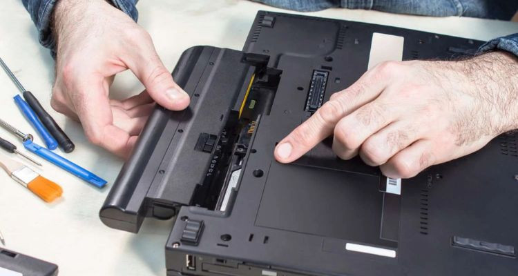 Bước tiếp theo cần thực hiện ngay là tháo pin. Pin laptop chính là nguồn năng lượng của laptop, vì thế nó cần được bảo vệ ngay lập tức. Các linh kiện có thể tháo rời cũng cần được tháo ra, sau khi tháo pin laptop bao gồm ổ cứng và Ram. Trước khi chạm vào các bộ phận của thiết bị, hãy nối đất vì tĩnh điện có thể phá hủy các mạch điện.