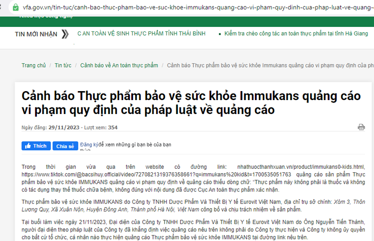 Tại buổi làm việc ngày 21/11/2023, Đại diện của Công ty TNHH Dược Phẩm Và Thiết Bị Y tế Eurovit Việt Nam do Ông Nguyễn Tiến Thành, người đại diện theo pháp luật của Công ty đã khẳng định việc quảng cáo nêu trên không phải do Công ty thực hiện và Công ty không ủy quyền cho bất cứ tổ chức, cá nhân nào thực hiện quảng cáo TPBVSK Immukans tại đường link nêu trên.