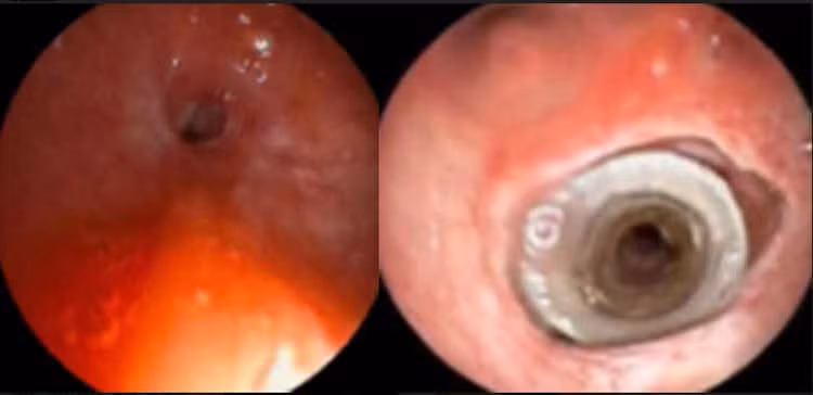 Hình ảnh khí quản bị hẹp (trái) và sau can thiệp đặt stent (bên phải)