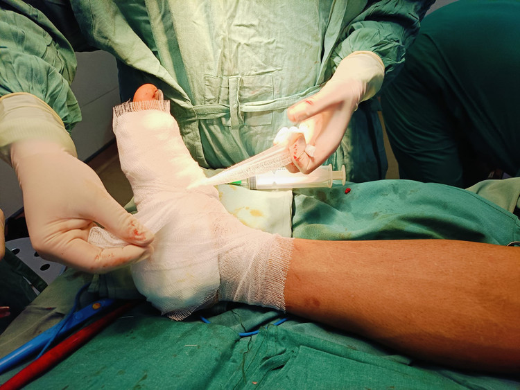 Kíp mổ khoa Chấn thương chỉnh hình đã phối hợp với kíp gây mê hồi sức của khoa Phẫu thuật – gây mê hồi sức tiến hành lấy dị vật, cầm máu, cắt lọc vết thương bị dập nát và khâu phục hồi bàn chân theo giải phẫu thành công.