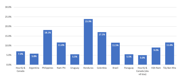 Biểu đồ 2: Mức tăng năng suất trung bình khi trồng ngô BĐG tại các nước, từ năm 1996–2020 (đơn vị: %)