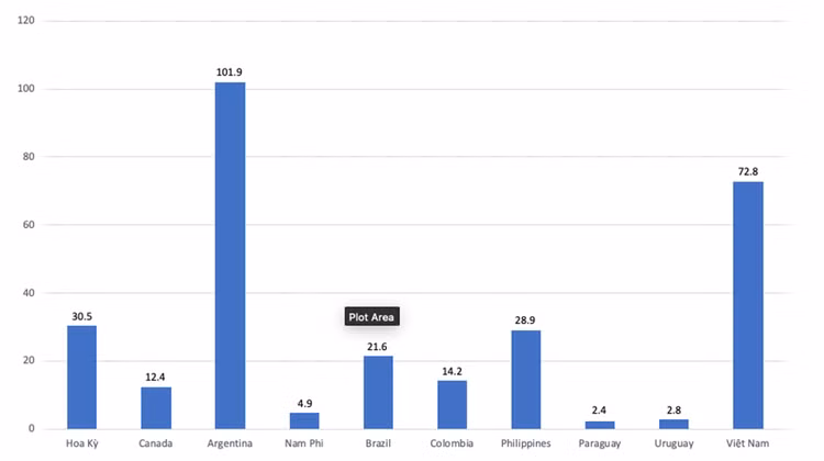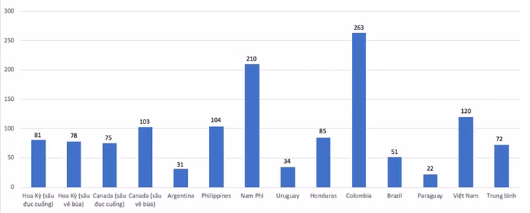 Biểu đồ 3: Mức thu nhập nông hộ gia tăng trung bình từ việc sử dụng ngô kháng sâu theo từng quốc gia trong giai đoạn 1996-2020 (đơn vị: đô la Mỹ/ha)