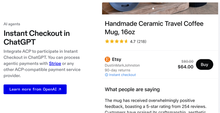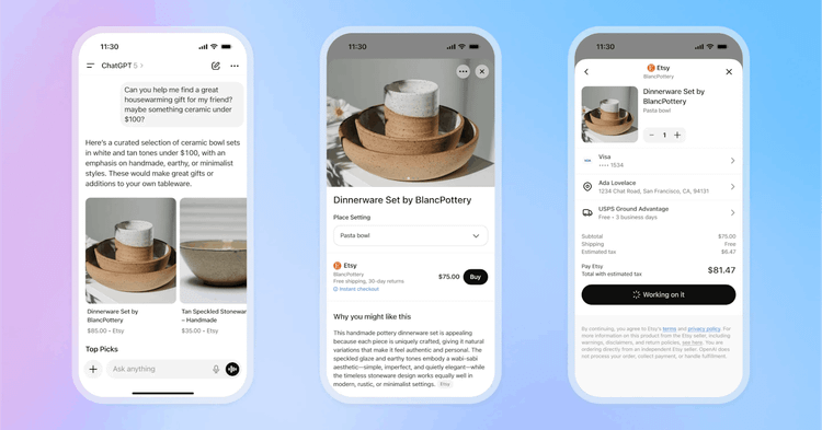 OpenAI cho biết đang triển khai tính năng Instant Checkout với các nhà bán hàng Etsy ngay hôm nay và sẽ sớm bổ sung hơn một triệu người bán từ Shopify, bao gồm các thương hiệu như Glossier, Skims, Spanx và Vuori.
