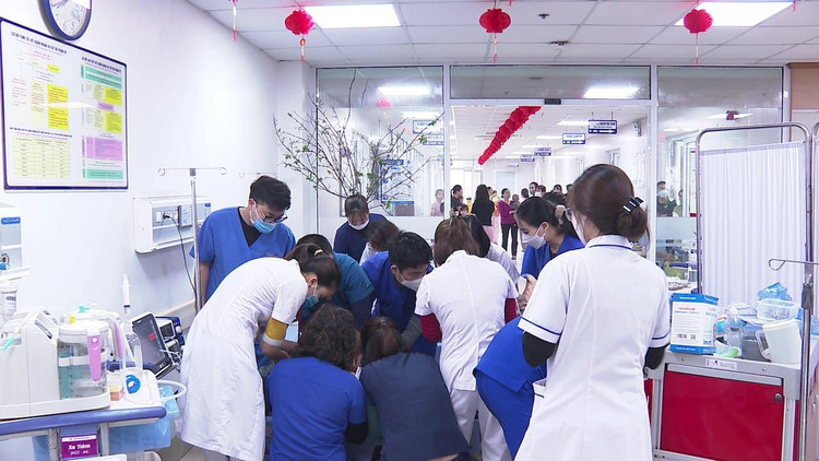 Trước tình trạng nguy kịch của trẻ, các bác sĩ phòng khám đã kích hoạt báo động đỏ toàn viện, êkip gồm các y bác sỹ Khoa cấp cứu, khoa Hồi sức tích cực chống độc, khoa sơ sinh đã tập trung cấp cứu bóp bóng, ép tim, tiêm thuốc trợ tim, trẻ bắt đầu có nhịp tim trở lại và được đưa lên nằm điều trị tích cực tại khoa Hồi sức tích cực - chống độc, tiên lượng nặng.
