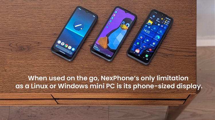 Trong Android, người dùng có thể khởi chạy Linux Debian như một ứng dụng, với tăng tốc GPU, hướng tới môi trường làm việc và phát triển nghiêm túc thay vì chỉ mang tính thử nghiệm. Khi cần làm việc với các phần mềm desktop đầy đủ, NexPhone cho phép khởi động lại để dual-boot sang Windows 11 ARM.