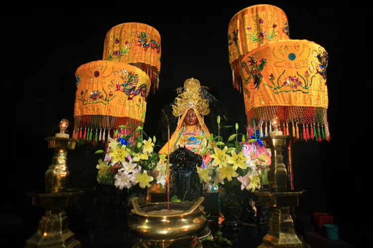 Bên trong là tượng nữ thần tạc bằng đá hoa cương đen ngồi trên bệ đá hình đài sen, lưng tựa phiến đá lớn hình lá bồ đề. Đây là một kiệt tác điêu khắc Chăm, là sự kết hợp giữa kỹ thuật tượng tròn và chạm nổi. Vào thời thuộc địa, người Pháp đã lấy mất đầu tượng, nay đã được phục chế.