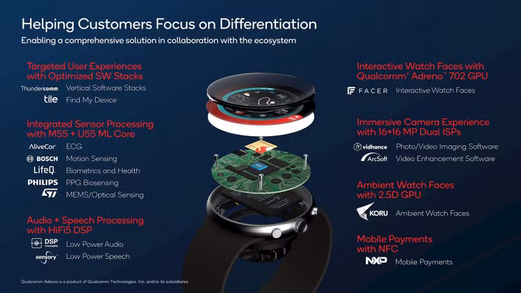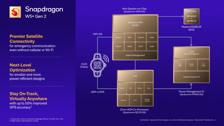 Nền tảng Snapdragon W5+ Gen 2 được trang bị bộ đồng xử lý tiết kiệm điện năng, vốn không có trên Snapdragon W5 Gen 2.
