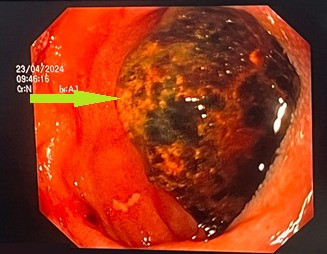 Thông qua hình ảnh chụp cắt lớp vi tính ổ bụng và nội soi tiêu hóa, các bác sĩ chẩn đoán bệnh nhân bị tắc tá tràng do sỏi mật (Hội chứng BOUVERET) kích thước rất lớn 3x5cm rò từ túi mật vào trong lòng tá tràng.