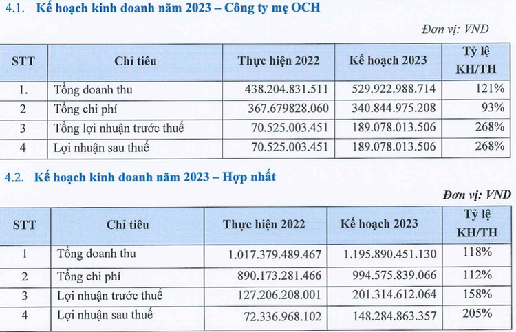 Năm 2023, OCH đặt mục tiêu tổng doanh thu đạt 1.196 tỷ đồng, tăng 18% so năm 2022. Lợi nhuận sau thuế 148 tỷ đồng, gấp 2 lần năm trước.