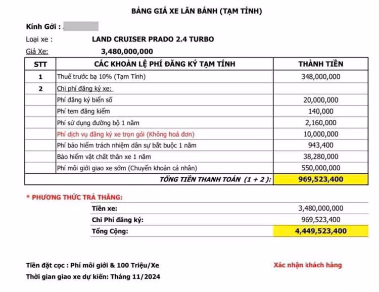 Chưa hết, Prado cũng gây tranh cãi trên mọi diễn đàn về xe cộ sau khi bảng báo giá (có vẻ được gửi tới một khách hàng cá nhân) cho thấy nếu muốn có xe, người mua sẽ phải trả 550 triệu đồng dưới danh nghĩa "phí môi giới giao xe sớm".