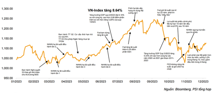 Báo cáo chiến lược 2024 của Chứng khoán Dầu khí (PSI) cho biết, trong năm 2023, thị trường đã trải qua nhiều biến động: nửa đầu năm 2023, thị trường chứng khoán Việt Nam giao dịch trầm lắng, thanh khoản sụt giảm mạnh so với năm ngoái. Nguyên nhân chủ yếu đến từ sự suy giảm tăng trưởng của các nền kinh tế lớn, lạm phát dai dẳng cùng chính sách thắt chặt tiền tệ kéo dài của các nền kinh tế lớn và căng thẳng địa chính trị ngày càng phức tạp.