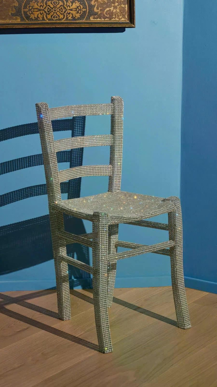 Chiếc ghế đó không phải vật dụng thông thường, mà là tác phẩm của nghệ sĩ đương đại Nicola Bolla, mang tên Van Gogh Chair, được chế tác kỳ công bằng kính cắt máy và phủ kín pha lê Swarovski óng ánh. Đây là lời tri ân tới bức tranh Chiếc ghế của Van Gogh (Van Gogh's Chair) (1888), biểu tượng cho sự giản dị và cô độc trong thế giới nội tâm của danh họa Hà Lan.