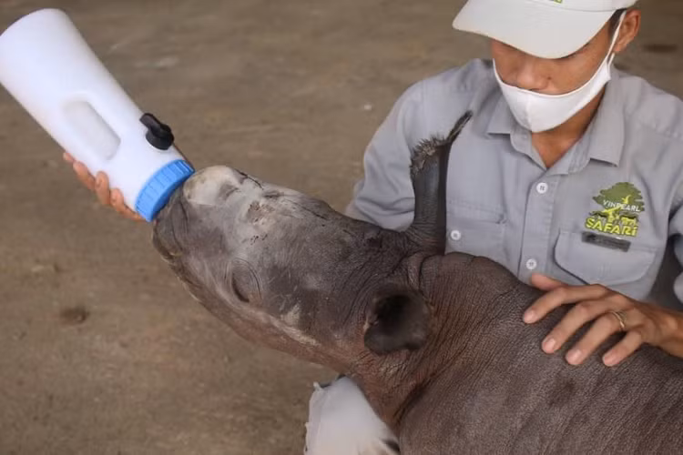 Nhiệm vụ đầu tiên là làm sao xoa dịu được cơn đói của đứa trẻ nặng gần bằng một người lớn. Đội ngũ chăm sóc, người thì tiếp cận tê giác mẹ xin vắt sữa, người thì vỗ về, thủ thỉ, ôm ấp chú tê giác nhỏ vốn chưa hết sợ sệt.