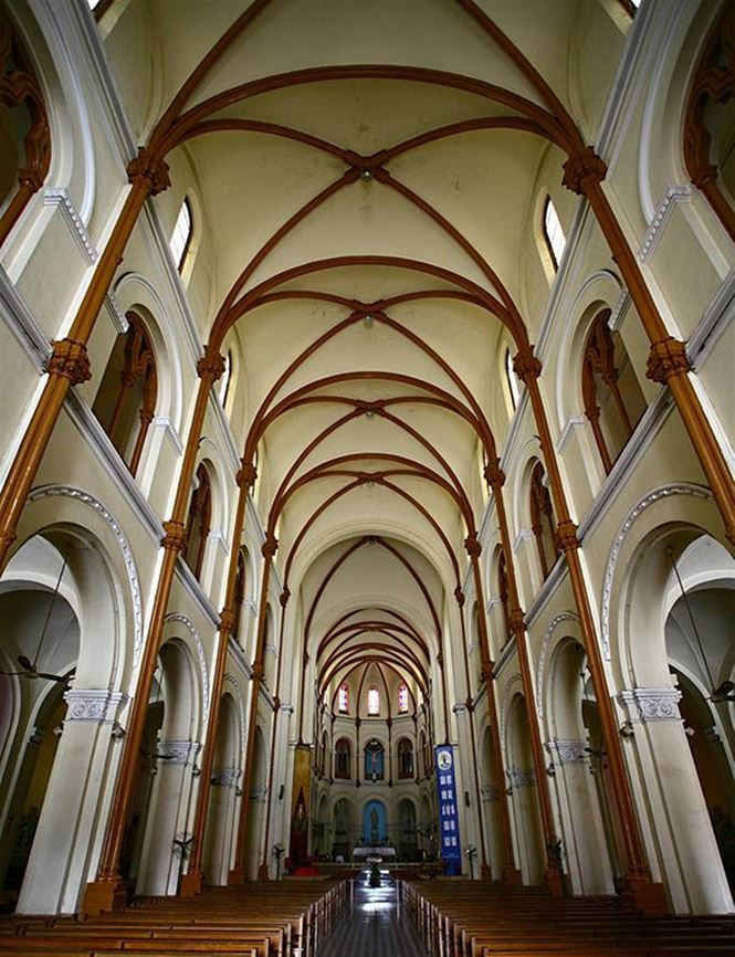 Toàn bộ thánh đường gồm 56 ô cửa kính màu do hãng Lorin của quận Chartres sản xuất. Móng của thánh đường được thiết kế đặc biệt, chịu được tải trọng gấp 10 lần toàn bộ kiến trúc ngôi nhà thờ nằm bên trên. Đặc biệt, nhà thờ không có hàng rào hoặc bờ tường bao quanh như các nhà thờ quanh vùng Sài Gòn – Gia Định ngày ấy.