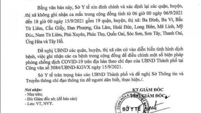 Văn bản thể hiện các quận/huyện không có ca mắc trong cộng đồng từ 6h ngày 6/9 của Sở Y tế Hà Nội.