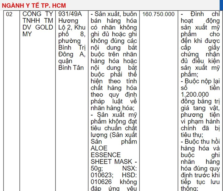 Theo quyết định xử phạt, Công ty Gold My sản xuất, buôn bán hàng hóa có nhãn không ghi đủ hoặc ghi không đúng nội dung bắt buộc trên nhãn hàng hóa hoặc nội dung bắt buộc phải thể hiện theo tính chất hàng hóa; sản xuất mỹ phẩm không đạt tiêu chuẩn chất lượng (mặt nạ Aloe Essence Sheet Mask - 50g; NSX: 1/6/2023; HSD 1/6/2026 không đáp ứng yêu cầu chất lượng về chỉ tiêu giới hạn vi sinh vật) và sản xuất mỹ phẩm khi chưa được cấp giấy chứng nhận đủ điều kiện.