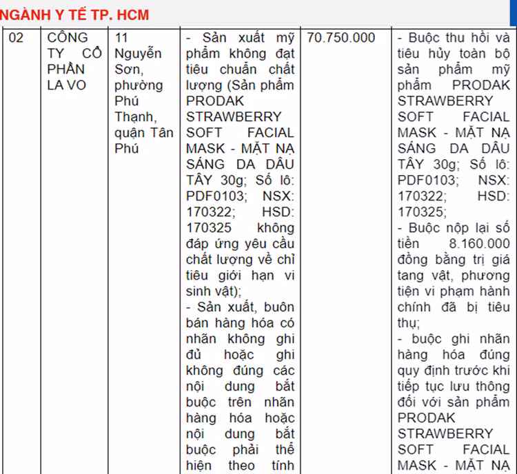 Theo cơ quan chức năng, Công ty Cổ phần La Vo sản xuất mỹ phẩm không đạt tiêu chuẩn chất lượng. Cụ thể, sản phẩm Prodak strawberry soft facial mask - mặt nạ sáng da dâu tây 30g, số lô PDF0103; NSX 170322; HSD 170325 không đáp ứng yêu cầu chất lượng về chỉ tiêu giới hạn vi sinh vật.