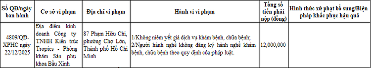 Bên cạnh đó, Địa điểm kinh doanh Công ty TNHH Kiến trúc Tropics - Phòng khám Sản phụ khoa Bầu Xinh (địa chỉ 87 Phạm Hữu Chí, phường Chợ Lớn, TP HCM) cũng bị Sở Y tế TP HCM phạt 12 triệu đồng theo Quyết định số 4809/QĐ-XPHC ngày 22/12/2025, do không niêm yết giá dịch vụ khám bệnh, chữa bệnh; người hành nghề không đăng ký hành nghề khám bệnh, chữa bệnh theo quy định của pháp luật.
