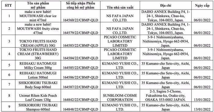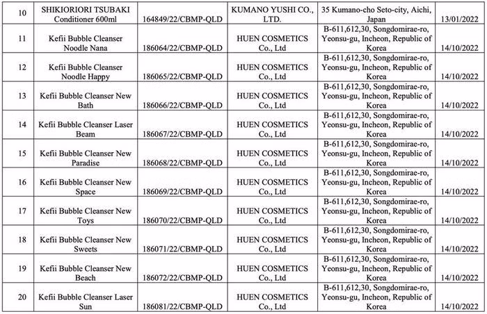 Danh sách 20 sản phẩm bị thu hồi số tiếp nhận phiếu công bố sản phẩm/Ảnh chụp màn hình