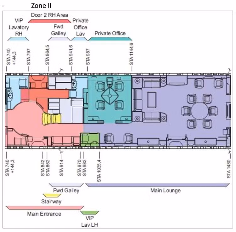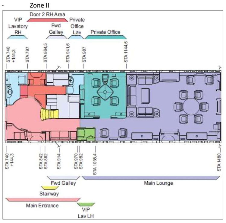 Cabin rộng 4.500 feet vuông (418 mét vuông) và thông thường một máy bay có kích thước này có thể chở tới 450 hành khách. Máy bay phản lực này có sức chứa ít hơn nhiều, mặc dù ở môi trường đẹp hơn nhiều.