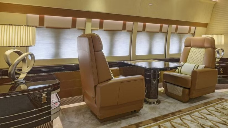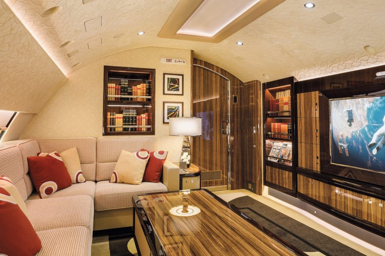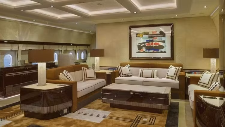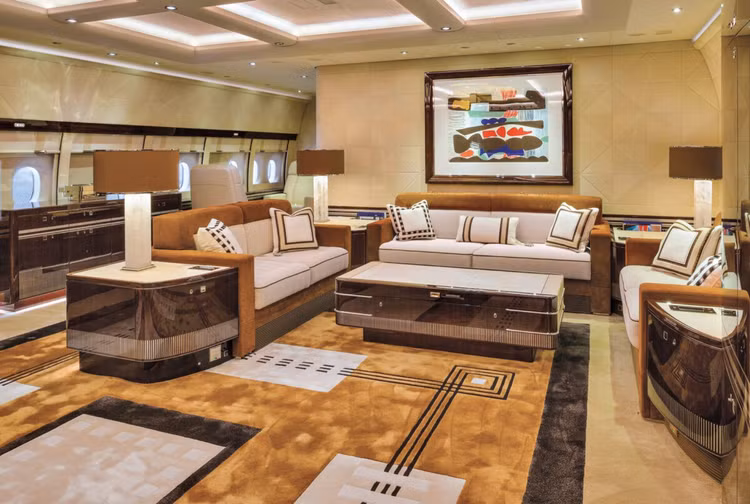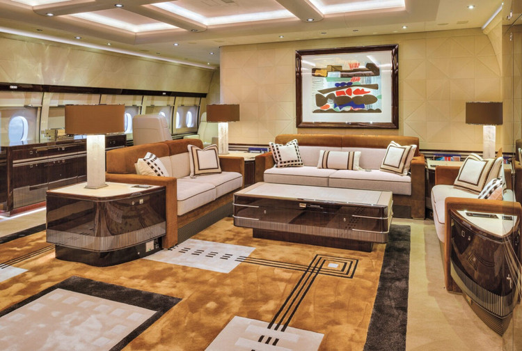 Điểm nhấn của máy bay phản lực là không gian sinh hoạt chính, có ba ghế sofa cỡ lớn và trần nhà hình vòm. Đồ đạc được thiết kế và đặt làm riêng, bao gồm một chiếc bàn gỗ wacapou có mặt bàn bằng da dê.