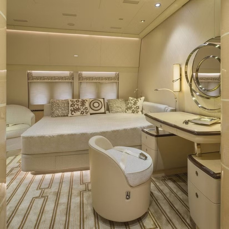 Đối với Tổng thống Trump, máy bay phản lực tư nhân Boeing 747-8 tự hào có phòng ngủ khép kín sang trọng. Phòng ngủ chính này nằm ở mũi máy bay, ngay bên dưới buồng lái. Đây là khu vực riêng tư nhất của máy bay và cũng là nơi yên tĩnh nhất vì xa động cơ nhất.