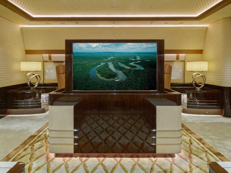 Nội thất của 747 ban đầu được thiết kế và trang bị bởi công ty thiết kế Cabinet Alberto Pinto. Công ty đã hoàn thiện nhiều nội thất máy bay phản lực VIP tùy chỉnh trong quá khứ, nhưng 747-8 là dự án máy bay phản lực tư nhân lớn nhất và tham vọng nhất mà công ty từng thực hiện. Phải mất bốn năm để hoàn thành và thường được mô tả là 'biệt thự bay '.