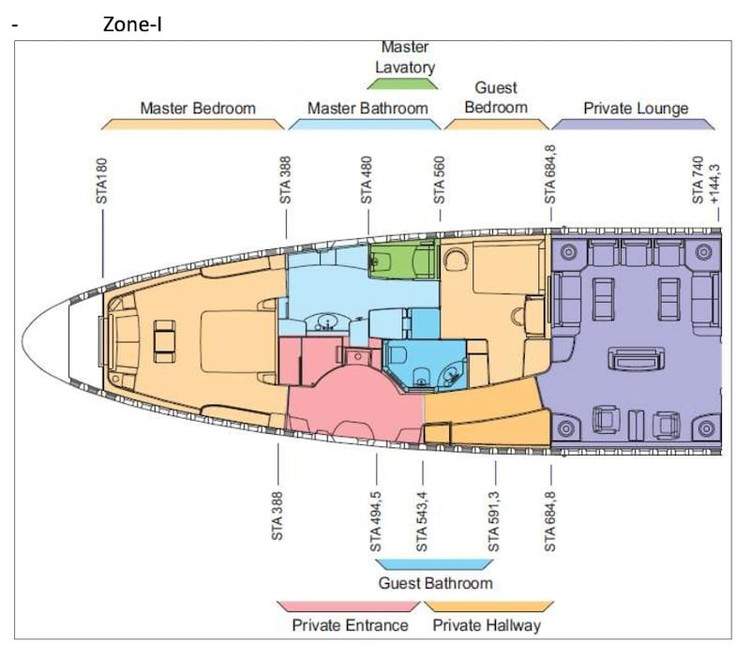 Phòng ngủ có một chiếc giường lớn với đế bằng da rám nắng, cùng với một chiếc ghế sofa hai chỗ ngồi để thư giãn riêng tư. Các bức tường bên được lót bằng quầy và tủ đựng đồ, trong khi một cánh cửa dẫn vào phòng tắm riêng.