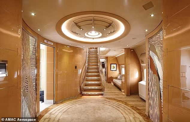 Lối vào máy bay phản lực có tường cong và cầu thang có đèn dẫn lên tầng trên. Lên cầu thang, ở 'bướu' mang tính biểu tượng của máy bay 747, là phòng khách đầy đủ với giá sách, ghế sofa góc và TV màn hình phẳng khổng lồ.