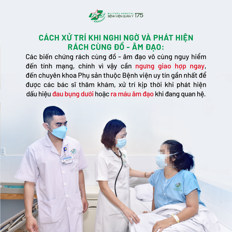 Các biến chứng rách cùng đồ âm đạo vô cùng nguy hiểm đến tính mạng, chính vì vậy cần ngưng giao hợp ngay và đến chuyên khoa Phụ sản thuộc Bệnh viện uy tín gần nhất để được các bác sĩ thăm khám và xử trí kịp thời.