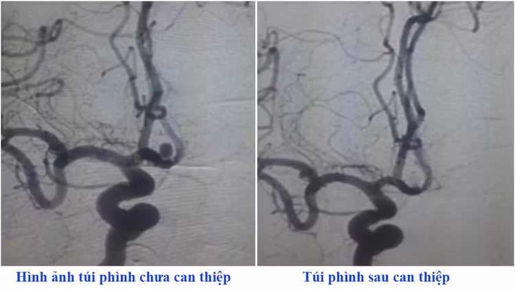 Khi chụp mạch máu não của bệnh nhân, các bác sĩ xác định đây là 1 túi phình kích thước 2x 3cm, cổ 2mm. Các bác sỹ can thiệp đã hội chẩn chuyên môn, mục tiêu nút kín túi phình. Ca can thiệp thành công, chụp kiểm tra lại thấy nút kín hoàn toàn túi phình.