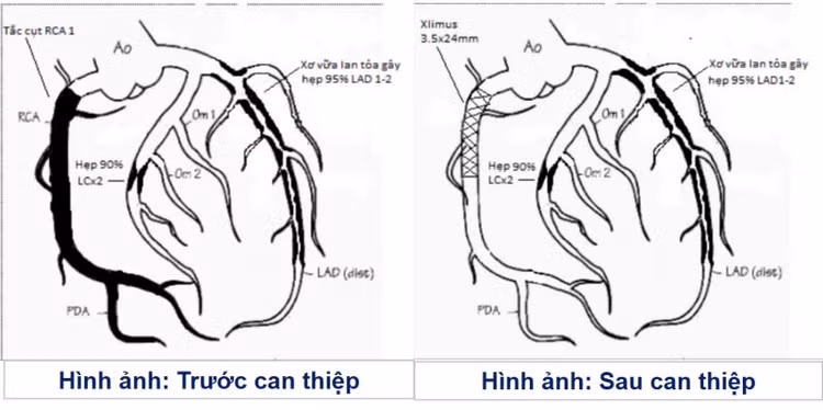 Bệnh nhân nhanh chóng được Ths.BS Đinh Danh Trình, Phó khoa Tim mạch - Bệnh viện Bãi Cháy Quảng Ninh cùng ê kíp đã tiến hành chụp mạch vành qua hệ thống chụp mạch số hóa xóa nền DSA cho thấy, bệnh nhân tắc hoàn toàn RCA 1, xơ vữa lan tỏa gây hẹp 90-95% LAD 1-2. Ê kíp vừa thực hiện hồi sức tim, đặt máy tạo nhịp tạm thời cấp cứu, tái thông động mạch vành, đặt 1 stent vào đoạn mạch bị tắc.
