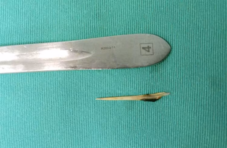 Trong quá trình mổ, ê-kíp phẫu thuật phát hiện ổ bụng bẩn nặng, nhiều giả mạc, dịch ổ bụng đục, tập trung ở hạ vị – hố chậu phải. Tại vị trí ruột non cách góc hồi manh tràng khoảng 1 mét, có dị vật hình xương cá dài khoảng 4cm chọc thủng ruột non tạo thành 01 lỗ thủng đường kính khoảng 0,5cm.