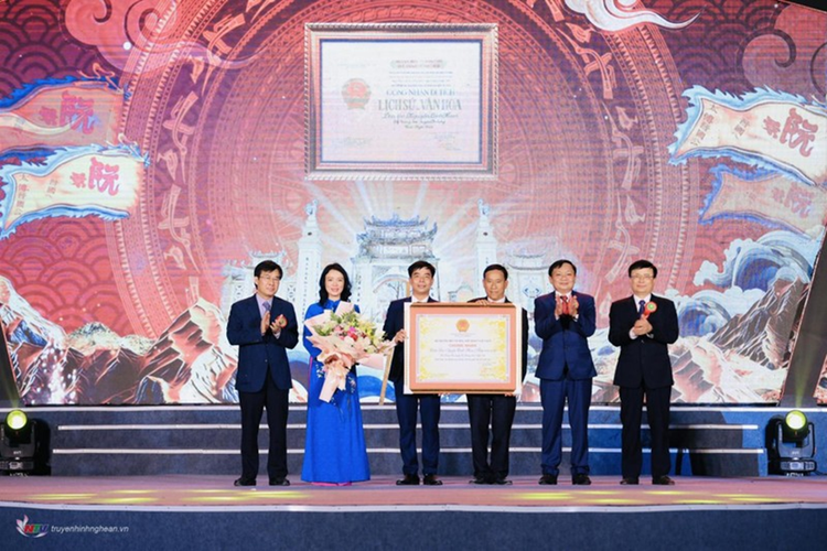 Trao bằng công nhận Di sản văn hoá phi vật thể Lễ hội Đền Nguyễn Cảnh Hoan. Ảnh: Truyền hình Nghệ An.