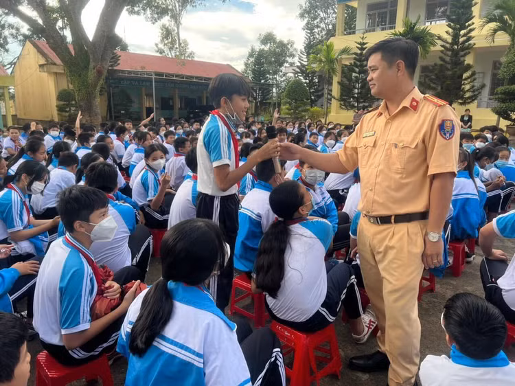 Để những buổi tuyên truyền thêm hiệu quả, các cán bộ, chiến sỹ cảnh sát giao thông còn đặt những câu hỏi tình huống, trò chơi liên quan đến bài tuyên truyền cho học sinh.